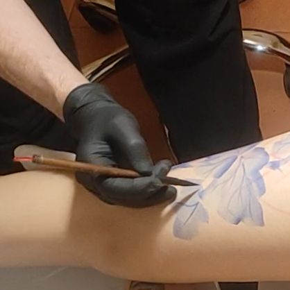 Con pinceles tradicionales y una tinta específica para la piel, consigo imprimir un diseño orgánico que se adapta a la anatomía de la zona del cuerpo seleccionada y ya sobre ello realizo el tatuaje. Video
