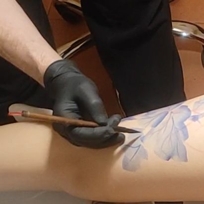 Proceso de diseño y realización con pinceles tradicionales y tinta específica para la piel, sobre lo que luego se realizó el tatuaje, todo en la misma sesión.